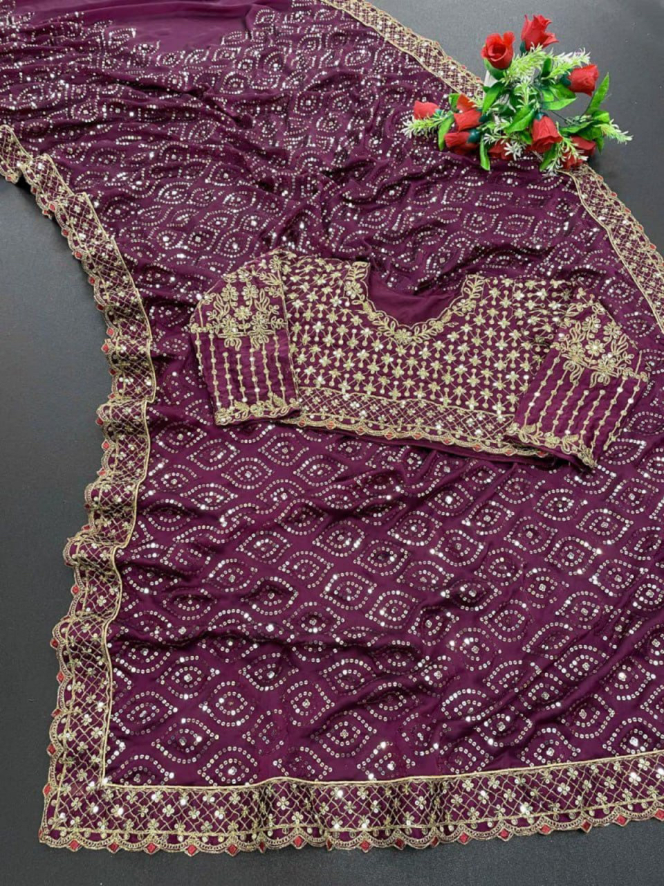 Sari Fabric : Pure Soft Kasturi Silk Georgette with Heavy Embroidery Multi Treads , Coding & Sequins Work  Blouse : Pure Soft Kasturi Silk Georgette With Heavy Embroidery Work 0.90 Mtr Unstitched Blouse.