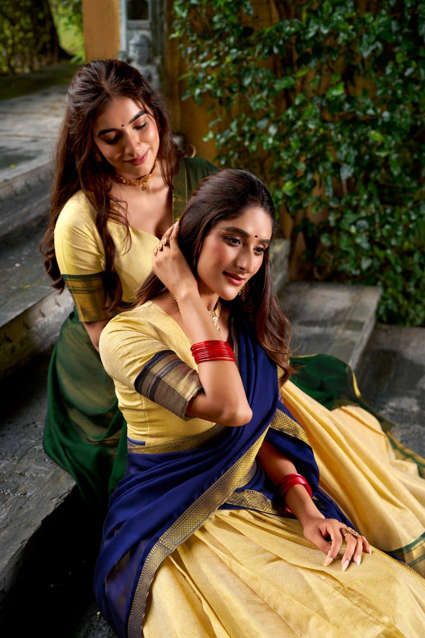 The golden charm of zari, the grace of Kanchipuram — a half saree that celebrates timeless tradition
