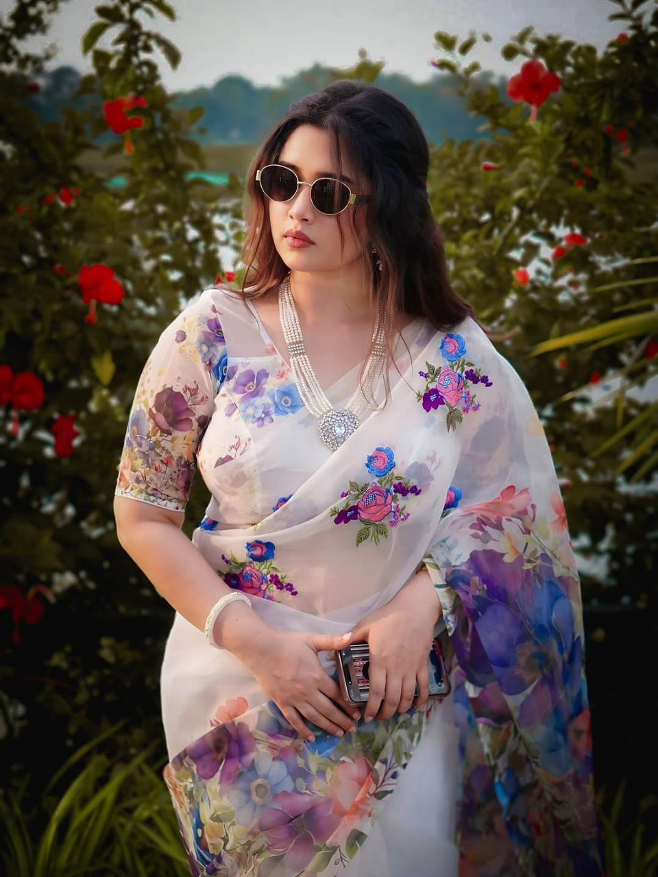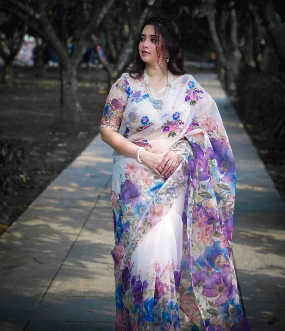 Soft Pure Shiny Organza Silk* Fabric Along With Fancy Floral Print Pallu With *Multi Coloured* Fancy Style Thread Work Along With Piping & Heavy Tussles & Floral Print Blouse.