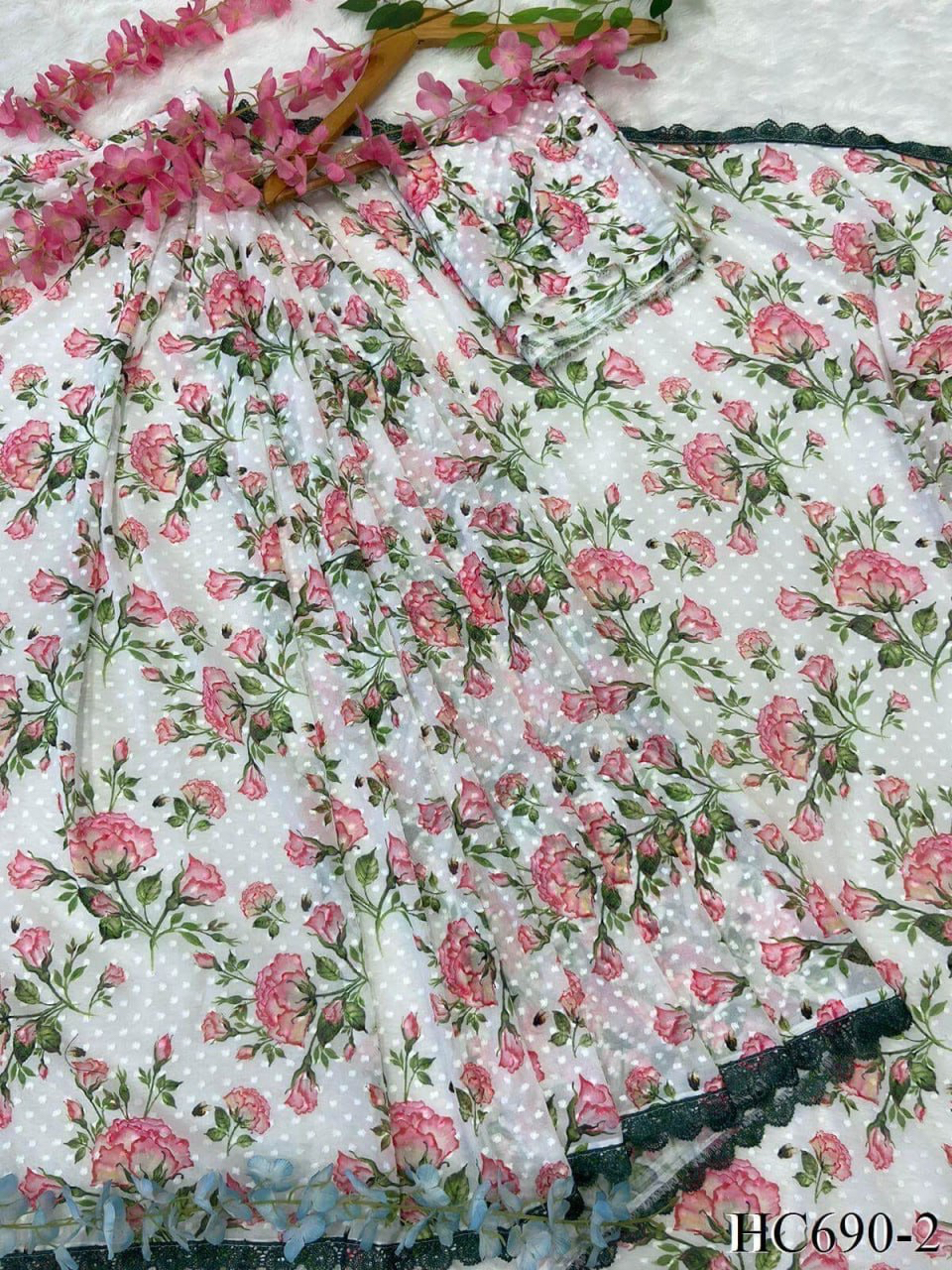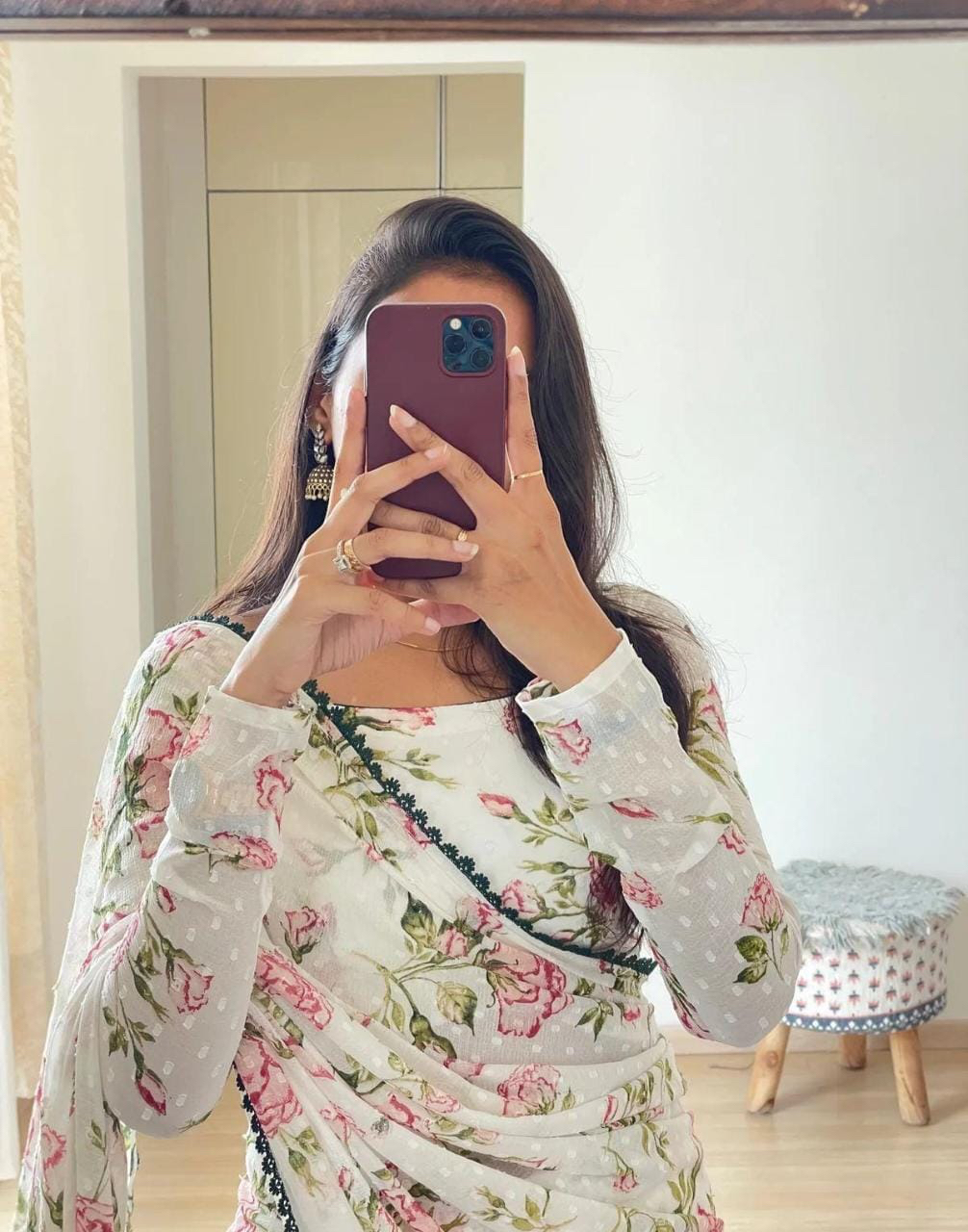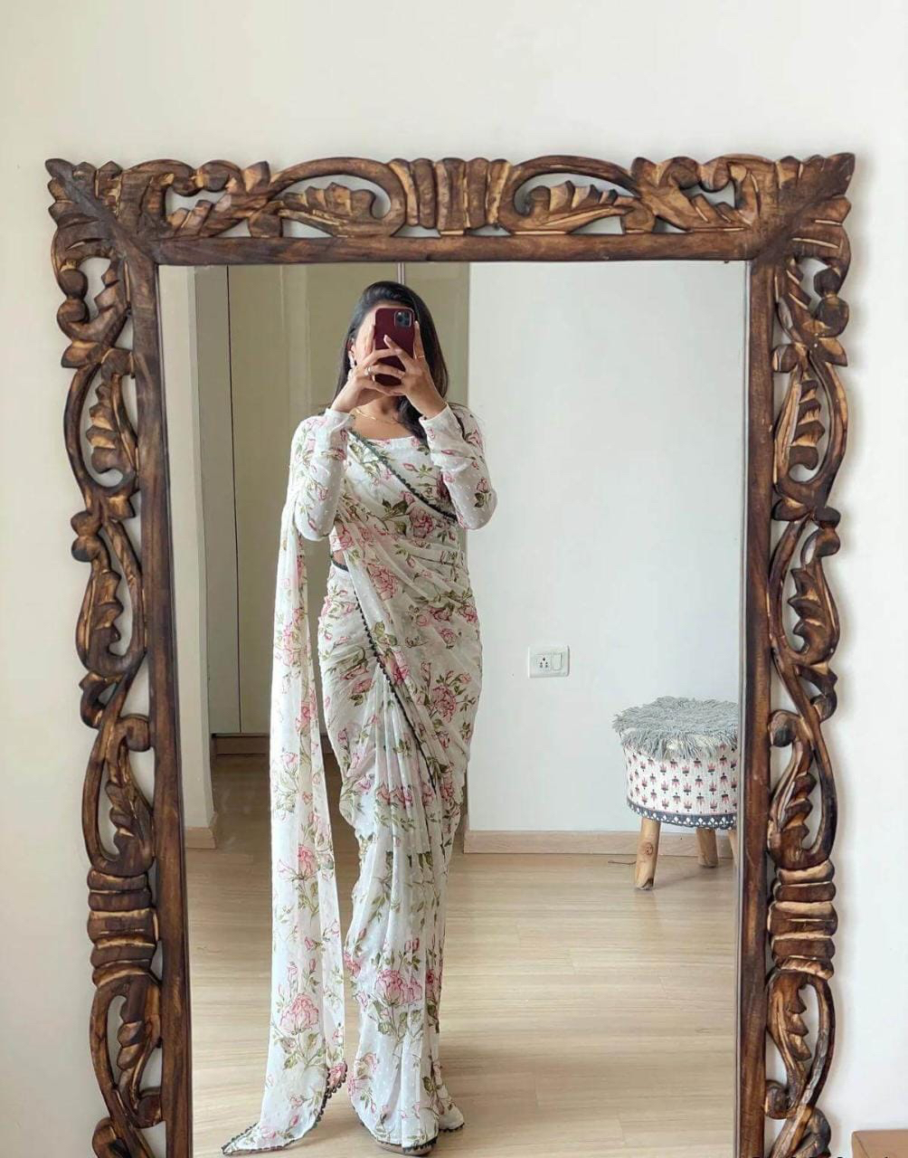 Ready To Wear 1 minutes saree* *Design White* *Now coming up with New Design pure soft Georgette silk Ready To Wear saree butti design in All over the body With beautiful flowers design all over the body and beautiful green colour lace border.